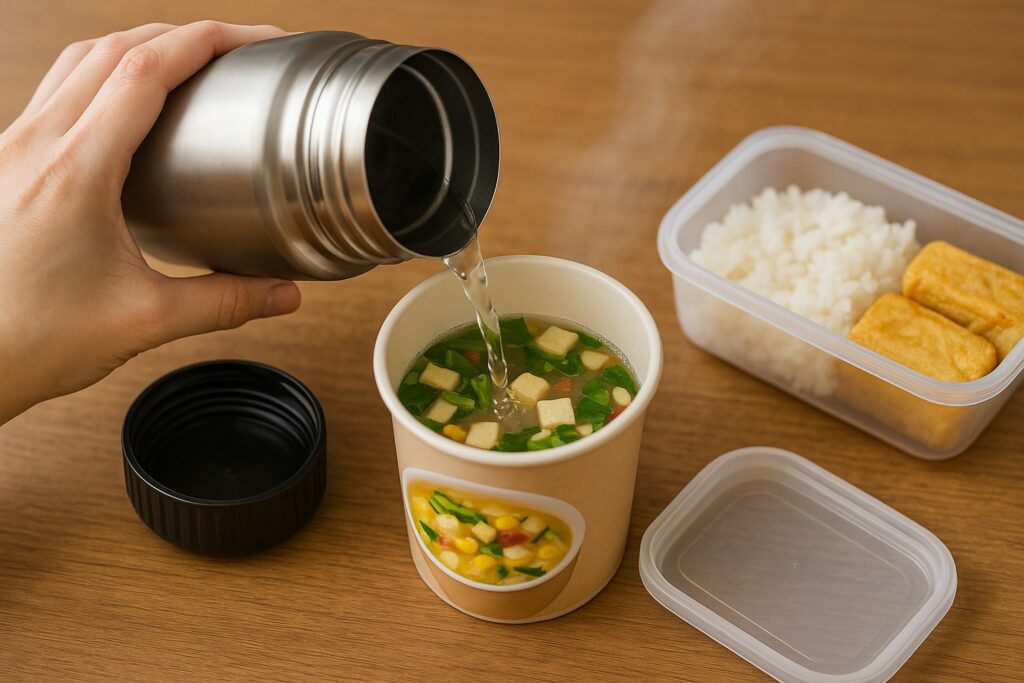 スープジャーに熱湯を注ぎ、インスタントの味噌汁やフリーズドライスープを入れるだけで、ランチタイムに手軽にあたたかいスープを楽しめます。