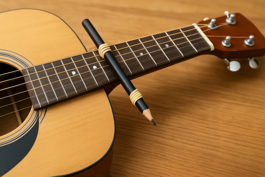 たとえば、旅行先や野外演奏でカポを忘れたときでも、身近な道具で即座に対応できる柔軟性は、ギタリストとしての経験値を高めてくれます。