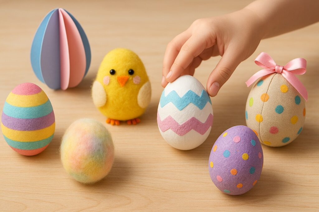 - 布エッグ:丸めた布やスポンジを包み、糸で縛って卵型に。刺繍やボタンで装飾するとおしゃれな仕上がりに。小花柄やドット柄の布を選ぶとかわいらしく、麻布を使えばナチュラルテイストにも仕上がります。端切れを使えばコストも抑えられ、環境にも優しい工作になります。