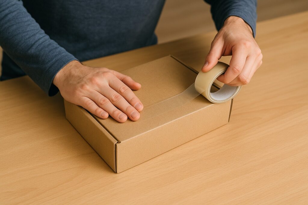テープを貼るときは箱を押しつぶさず、フタの角に沿って軽く指で押さえながら、均等な力で貼るのが仕上がりの美しさと安全性を両立するコツです。