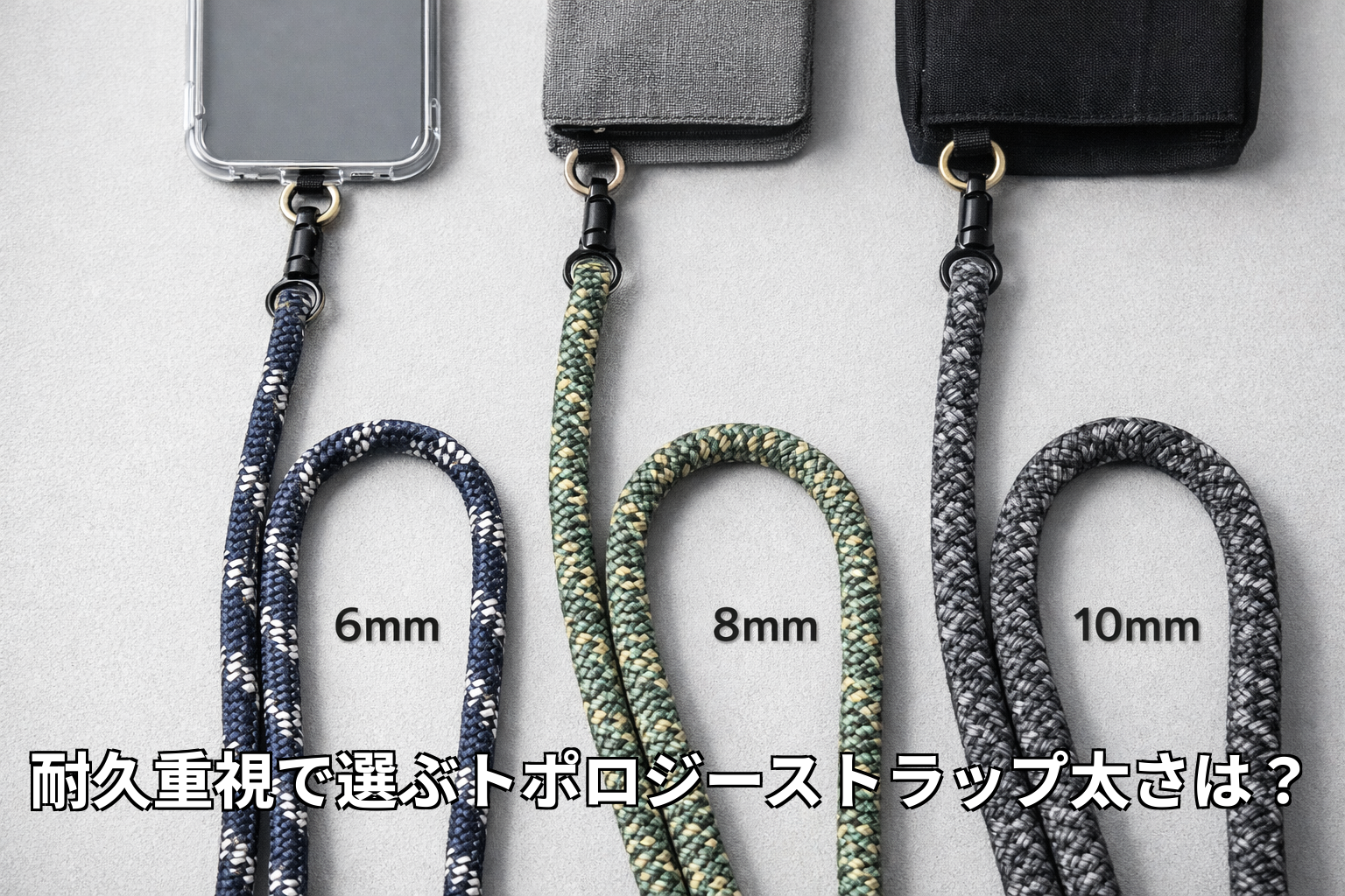 特にスマートフォン単体での使用や、鍵や小型アクセサリーなど軽量な物のみを携行する場合、6mmは十分な強度と耐久性を持っています。